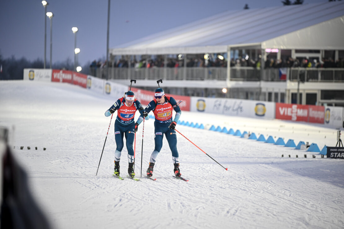 Ampumahiihdon maailmancupissa kilpailtiin lauantaina parisekaviesti ja sekaviesti. Suomi voitti parisekaviestin, kun ensimmäisenä maaliin tullut Saksa hylättiin. Saksalaisjoukkueen urheilija ei toisen makuuammunnan jälkeen laittanut asettaan selkään asianmukaisesti, mikä johti joukkueen hylkäämiseen turvallisuusmääräysten rikkeen vuoksi. Suvi Minkkinen ja Tero Seppälä olivat viestin kärkitaistossa mukana koko kilpailun ajan. Joukkue käytti yhteensä kahdeksan varapatruunaa. Ranska oli lopulta viestin toinen joukkueella Jeanne Richard ja Emilien Claude. Ranskalaiset käyttivät yhteensä kuusi varapatruunaa jääden suomalaisista maalissa 11 sekuntia. Norja nousi viestin kolmanneksi kaksikolla Juni Arnekleiv ja Martin Nevland.
